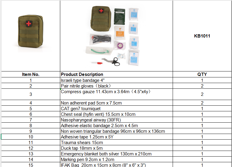 Yiwu Kebon Healthcare Co., Ltd ให้บริการปรับแต่ง OEM/ODM สำหรับองค์กรทหาร ตำรวจ และกู้ภัย สีกระเป๋า โลโก้ และเนื้อหาภายในสามารถปรับแต่งได้อย่างเต็มที่ตามข้อกำหนดของลูกค้าหรือมาตรฐานการป้องกันประเทศ